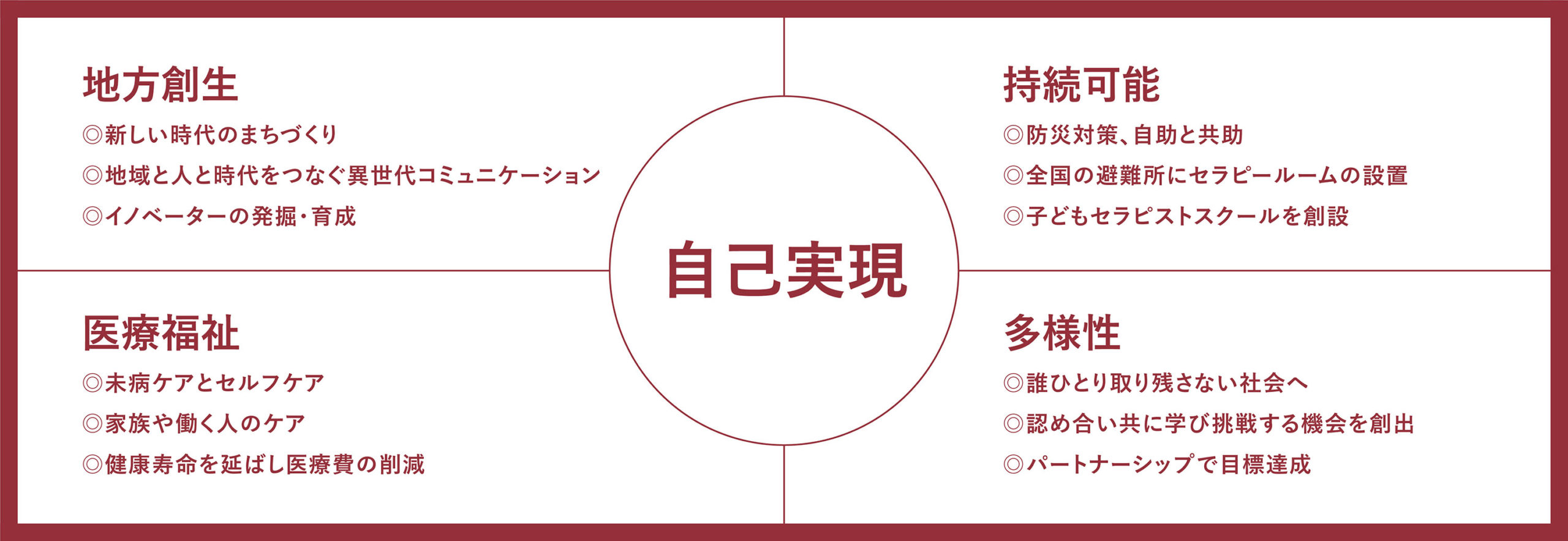 HIMEMIKO JAPANは、「自己実現」を中心に、地方創生・医療福祉・多様性・持続可能性の4つの視点から社会課題に向き合っています。